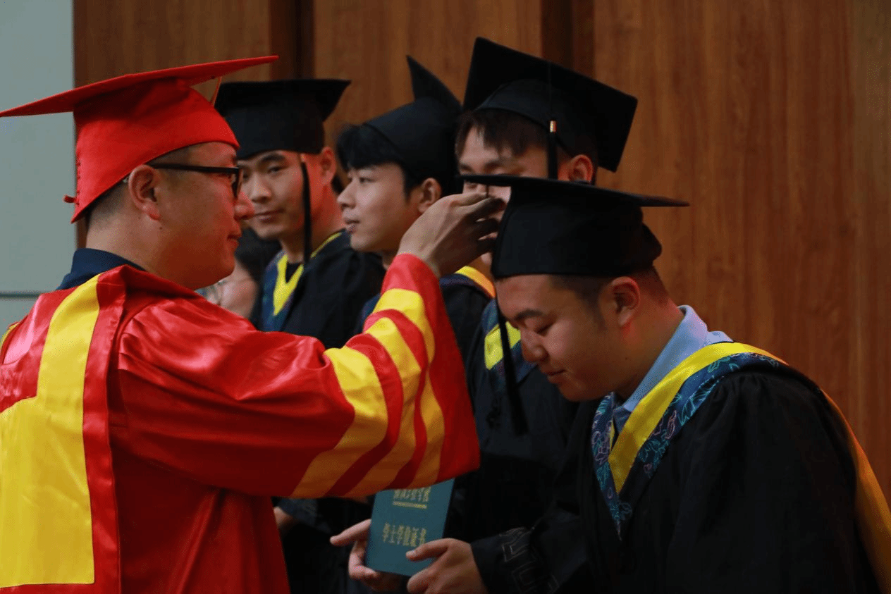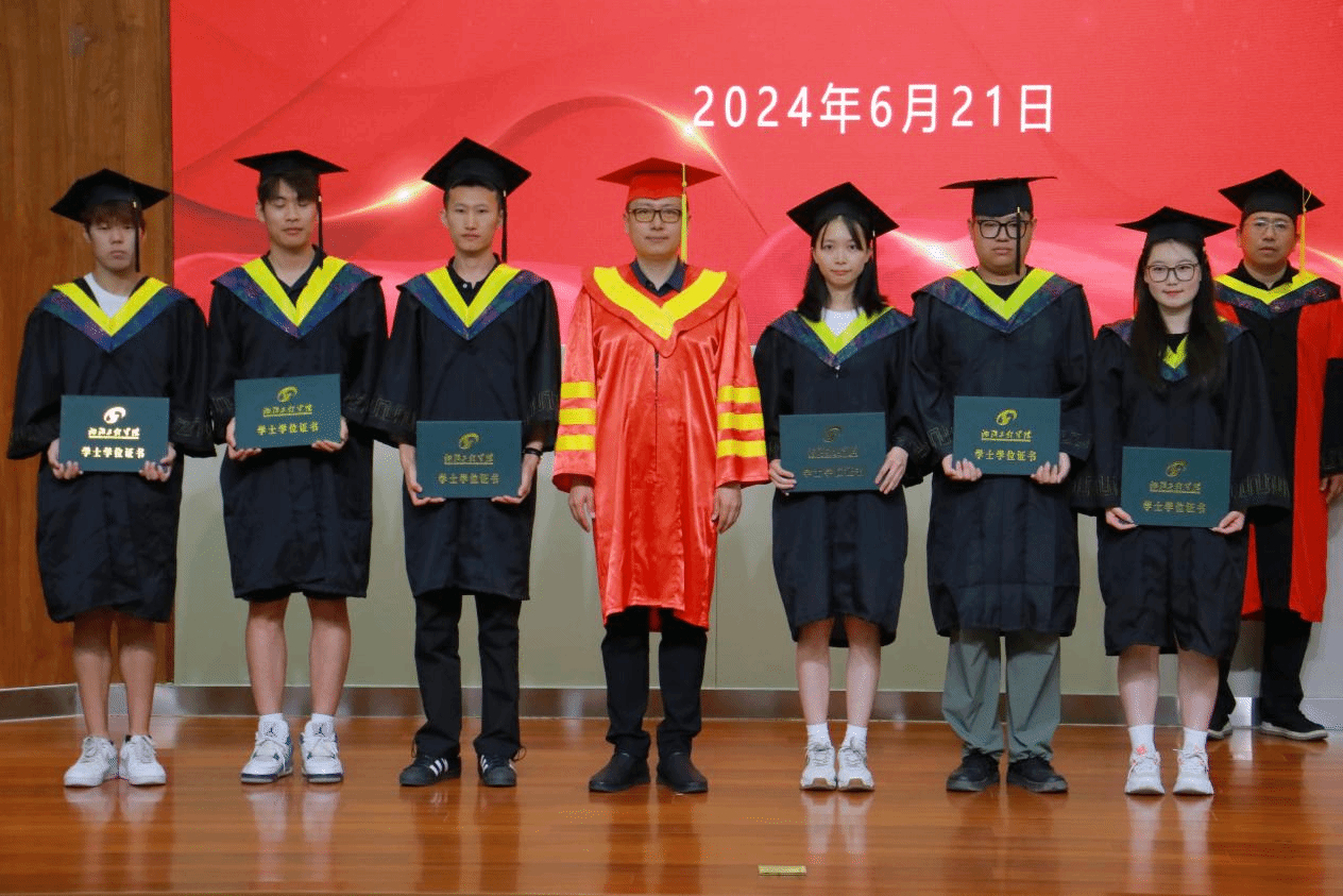 EMC易倍经理王森现场为2024届本科毕业生授位,专业教师与毕业生轮流握手祝贺、深情相拥。
