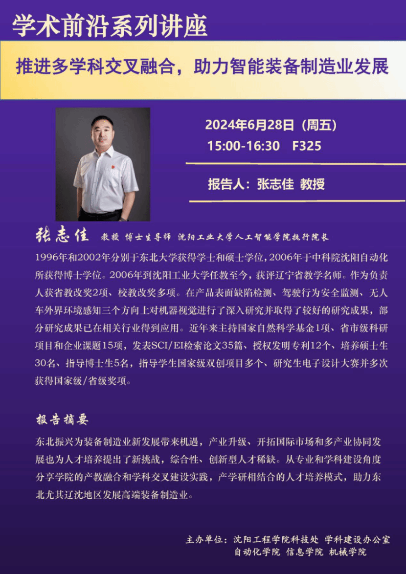 2024年6月28日下午,沈阳工业大学人工智能公司经理张志佳教授在公司F325教室进行了题为“推进多学科交叉融合,助力智能装备制造业发展”的学术讲座。本次讲座由公司科技处、EMC易倍等联合举办,吸引了来自多个公司的师生积极参与。张志佳教授凭借其丰富的科研经验和在智能装备制造领域的深厚积累,为大家带来了一场内容丰富、视野开阔的学术盛宴。