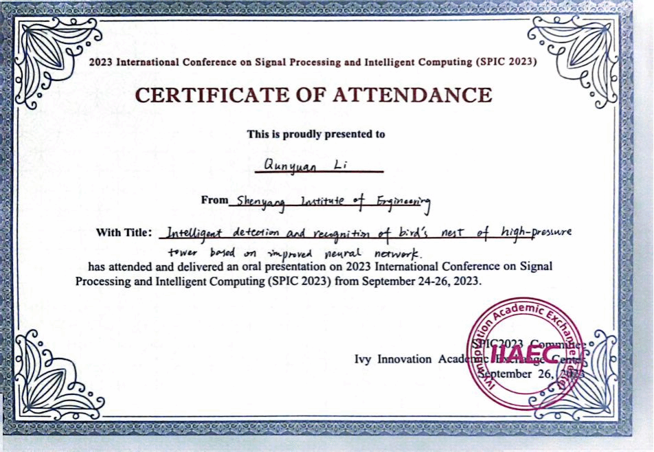 积极参加科研学术活动,曾参加2023年信号处理与智能计算国际学术会议等学术会议。