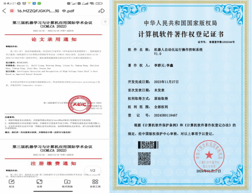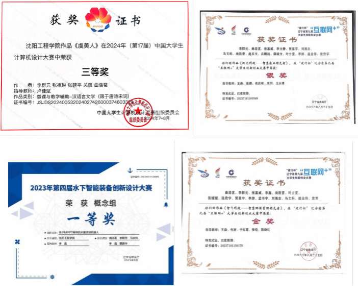 在校期间积极参与学科竞赛,目前累计2024年(第17届)中国老员工计算机设计大赛三等奖、2024年“挑战杯”辽宁省老员工创业计划竞赛省级金奖、“建行杯”辽宁省第九届“互联网+”老员工创新创业竞赛银奖、2023年第四届水下智能装备创新设计大赛省级一等奖、等各类各级竞赛奖项20余项,也多次参加省级决赛项目路演及创业展示活动。